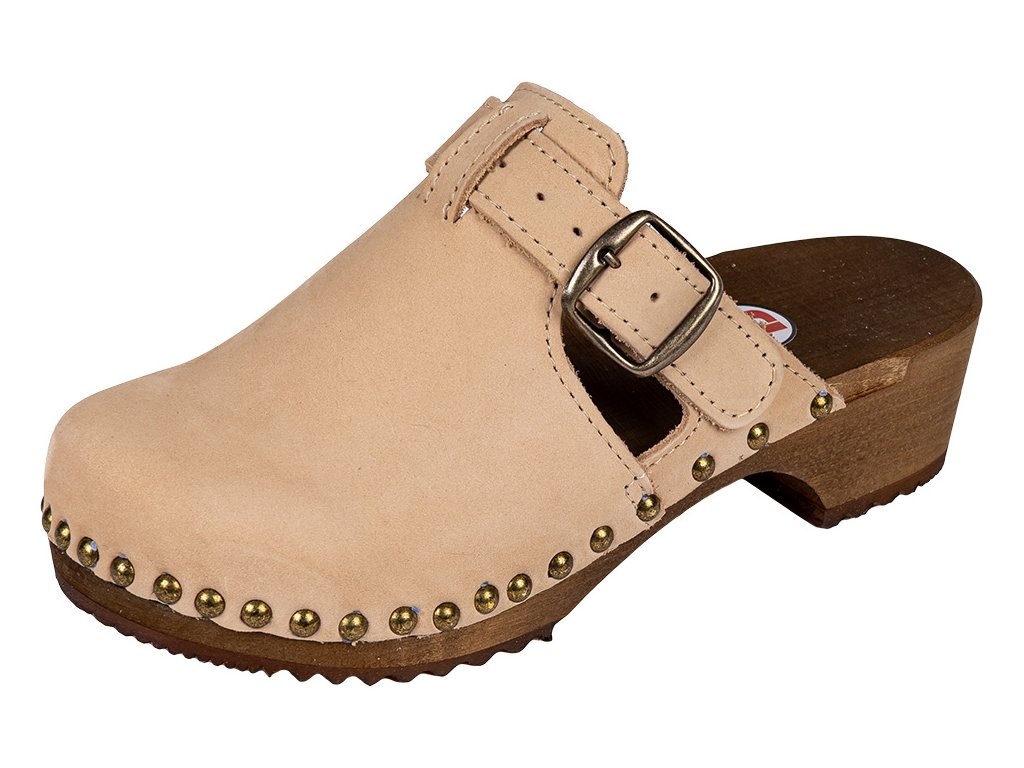 Pohodlné dřeváky jsou vyrobeny z přírodní kůže a světlého lipového dřeva. Model je šířkově nastavitelný a svršek je připevněn esteticky vypadajícími hřebíky. Podešev má profilovaný tvar, jemná podpora podélné klenby chodidla napomáhá korigovat podélné ploché nohy, patní jamka stabilizuje správnou polohu paty, eliminuje sklon k valgozitě pat. Dřevěná stélka se na rozdíl od kožené při používání nedeformuje, upevňuje správné držení těla, tlumí nárazy při chůzi, odlehčuje páteři a kloubům, skvěle saje pot a nezpůsobuje dření nohou. Výška podpatku je 5 cm, výška podpatku vzhledem ke špičce 3 cm.